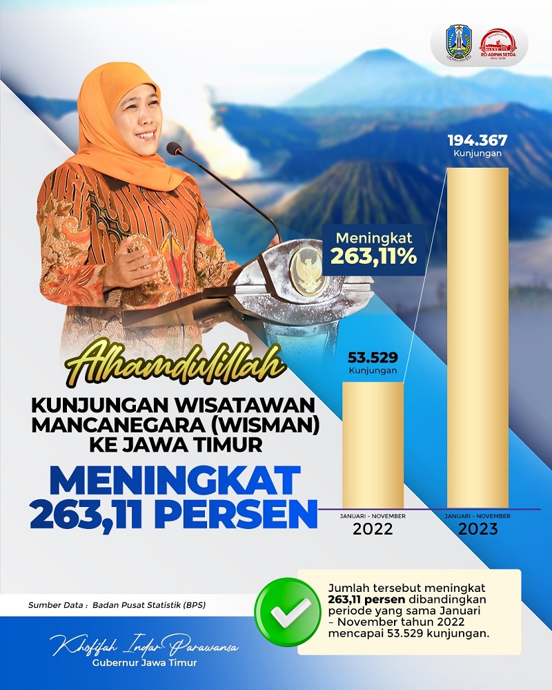 “Alhamdulillah, jumlah kunjungan Wisman ke Jatim mengalami peningkatan yang signifikan sebanyak 263,11 persen. Selama Januari-November 2023 kemarin jumlah kunjungan Wisman ke Jatim sebanyak 194.367 kunjungan. Sementara pada periode yang sama di tahun 2022 hanya 53.529 kunjungan Wisman di Jatim,” jelas Gubernur Khofifah, Kamis (4/1/2024).